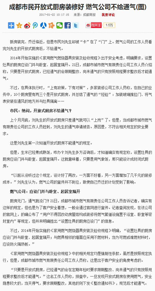 5.問(wèn):之前并不知曉開(kāi)放式廚房不能通氣,現(xiàn)在裝修好了才說(shuō)不能通氣,燃?xì)夤疽膊唤o客戶一個(gè)緩沖期,說(shuō)不通就不通,非常不人性化。